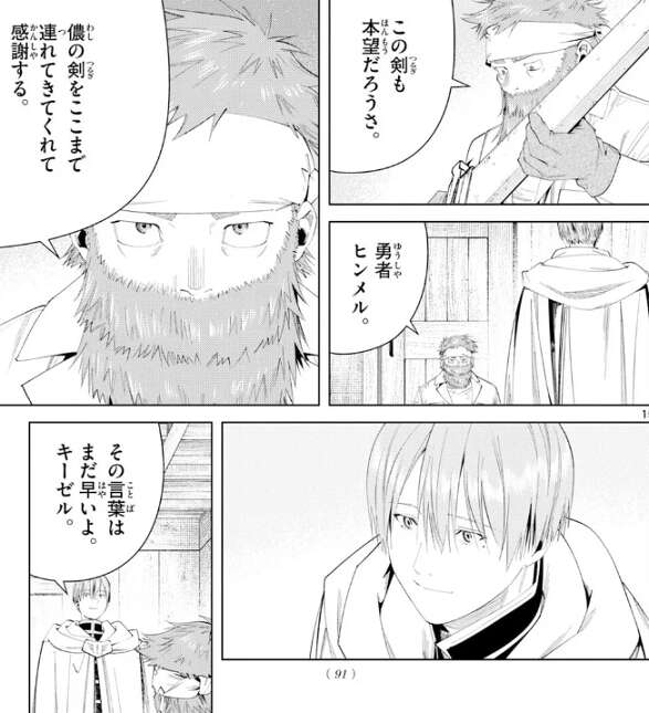 そして、まるで本物の勇者の剣のように活躍している事に、この剣も本望だろうさ、とキーゼルは言い、改めてこの剣をここまで連れてきてくれたことに感謝します。しかしヒンメルは、その言葉はまだ早いよ、と言い、この剣はもう僕の相棒だ、とキーゼルに言います。
