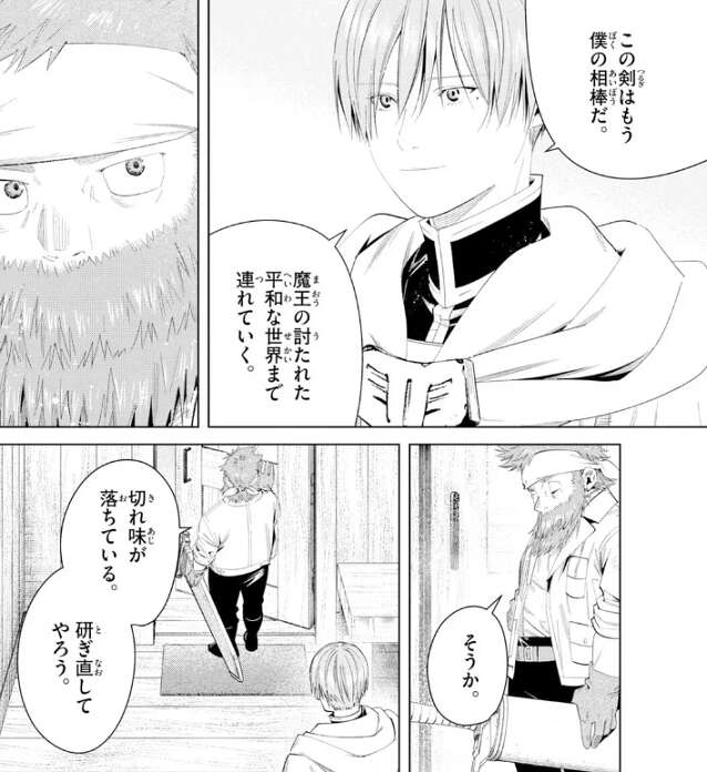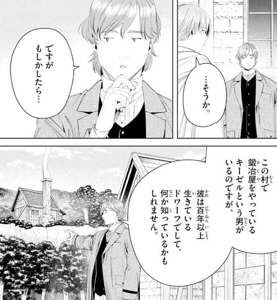 魔王の討たれた平和な世界まで連れて行く、とヒンメルが言うとキーゼルは納得し、そうか、と答えます。切れ味が落ちているので、せめて研ぎ直してやろう、とヒンメルの剣を研ぎ直します。剣の手入れも終わりヒンメルは剣を返してもらうと、キーゼルが昔に住んでいたという村の場所を教えてもらいます。その村は、今は魔物の巣窟になっているので、キーゼルは気を付けるようにヒンメルに注意します。