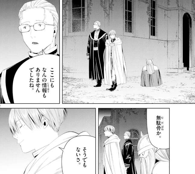聖堂を調べたヒンメル一行ですが、結局ここにも女神の石碑の情報はなく、無駄骨か、とアイゼンは肩を落とします。しかしヒンメルだけは、皇獄竜が討たれて、この地方がまた一つ平和になった、無駄なことではないよ、と前向きです。