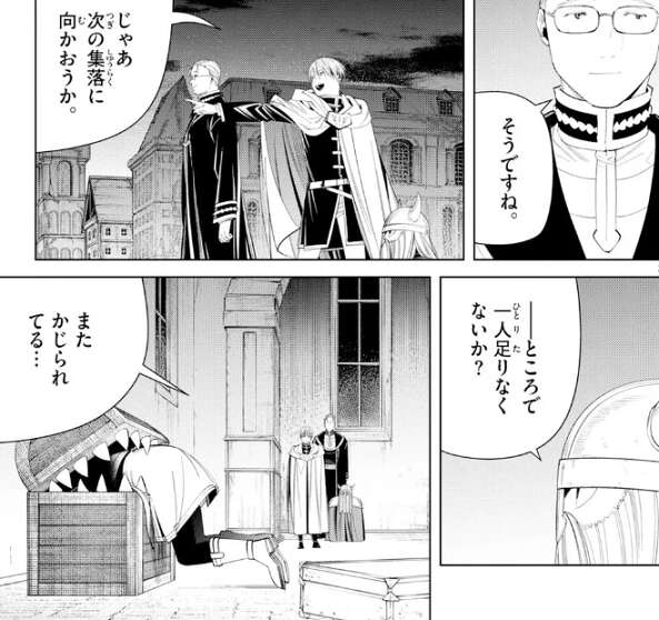 そして次の集落を目指そうとしますが、フリーレンの姿がありません。フリーレンは聖堂にあった宝箱をまだ探していたようで、またミミックにかじられています。
