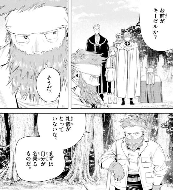 ヒンメルがキーゼルに話しかけると、礼儀がなっていないな、まずは自分が名乗るものだ、とキーゼルに言われてしまいます。改めてキーゼルに、僕は勇者ヒンメルだ、と名乗るとヒンメル一行に家に入るようにキーゼルは言います。