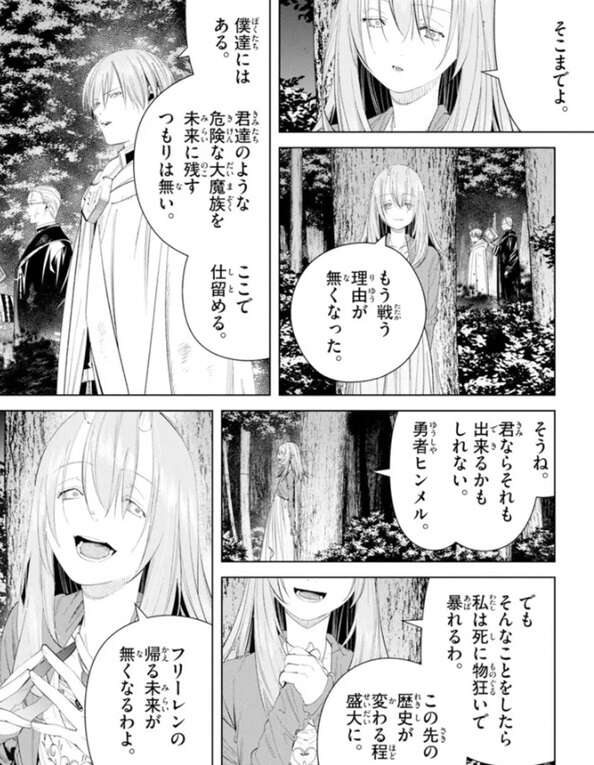 ダメージを負ったグラオザームはヒンメルに怒り、手段を選ばず攻撃しようとしますが、もう戦う理由が無くなった、とソリテールに止められます。ヒンメルは、グラオザームやソリテールのような大魔族を未来に残すつもりは無い、と言いここで仕留めようとしますが、ソリテールに、この先の歴史が変わるほど盛大に暴れるわ、フリーレンが帰る未来が無くなるわよ、と言われます。