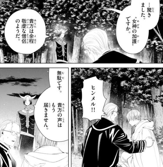 グラオザームの幻影に捕らわれたヒンメルとフリーレンですが、ハイターは女神の加護でグラオザームの幻影を防いでいました。ハイターはヒンメルに話しかけますが、ハイターの声は届きません。