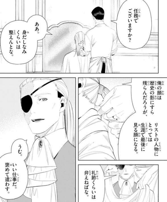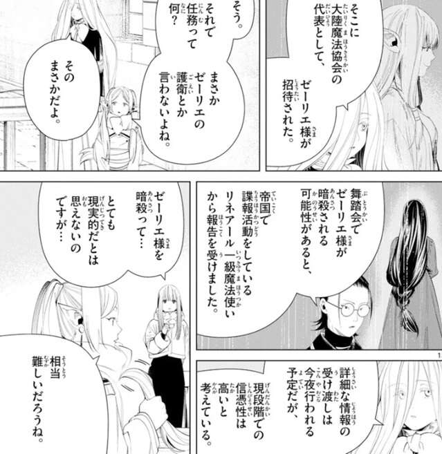 建国際の最終日に執り行われる舞踏会でゼーリエが暗殺される可能性があり、ゼーリエを護衛するのが任務の内容ですが、この暗殺には前回出てきた影なる戦士や、対魔法使い専門の特務機関が絡んでいそうです。閣下と呼ばれている男は、自分を歴史の影にすら残らないと言ったり、リストの事を言ったりしているので、影なる戦士の可能性が高そうです。魔法使いのフリーレンやゼーリエを暗殺の対象にしているという事は、対魔法使い専門の特務機関と思われますが、人類側の魔法使いを暗殺するのは何が目的でしょうか?魔族は今の所関わっていないようですが、魔族が絡んでいてもおかしくない不穏な感じがしますね。