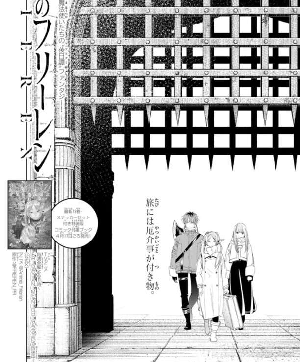 一方、フリーレン一行は帝国領 帝都アイスベルクにたどり着いていましたが、城門で待ち構えていたゼンゼとファルシュに捕まっていました。フリーレンは帝都アイスベルクで行われる建国際で魔道具を買いあさる予定だったのですが、それが任務で出来なくなってしまい、すごく悲しそうです。ゼンゼは、今回の任務は一級魔法使い5名による大規模任務だとフリーレン達に説明しますが、この場には一級魔法使いはゼンゼとファルシュ、フェルンの3人しかいないようですが…、とフェルンはゼンゼ達に聞きます。すると、残りはラントとユーベルのチームだとファルシュだと言い、ラントとユーベルのチームは今、情報収集に動いているそうです。フリーレンは任務の内容を聞き、第三次試験でゼーリエに落とされた自分は任務と関係ない、と不満そうです。