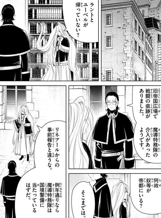 魔導特務隊は帝都にいないというリネアールの報告があったからこそ、ラントとユーベルへの情報の受け渡しはあのような形にしたそうです。ゼンゼはラントとユーベルを助けに行こうとしますが、その理由がユーベルに先輩面が出来るから、でファルシュが、そんなくだらないこと気にしてたんですか、とあきれています。しかし、ゼンゼは魔導特務隊に顔を覚えられる程恨まれているから、穏便に済まないとファルシュに言われてしまいます。ゼンゼは、恨まれている…か、心外だな、こちらは向こうと違い一人も殺していないというのに、と言い不服そうにしますが、ファルシュにリネアールが対処すると思うから少し様子を見ましょうと言われます。ゼーリエの現地入りは三日後のようで、それまでは波風は少ない方がいいとファルシュはゼンゼに自重を求めます。