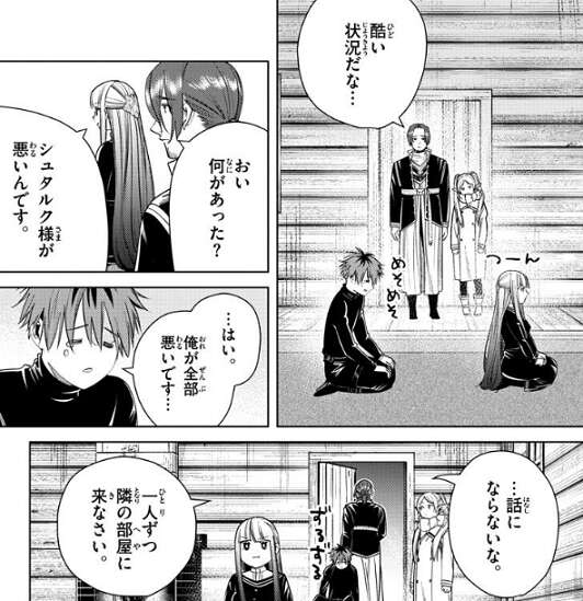 それから一月、フリーレン達が村で思い思いに過ごし、そろそろ寒波の時期が終わろうとするとき、フリーレンがザインのいる酒場を訪れます。なんだかシュタルクとフェルンの様子がおかしい、とフリーレンは言い、たぶん喧嘩しているので仲裁してよ、ザインに頼みます。小屋に戻ると、フェルンがつーんと怒っており、シュタルクがめそめそと泣いています。フェルンはシュタルクが悪いと言い、シュタルクは俺が悪いです…、と言いますが、話にならないとザインは一人ずつ隣の部屋で話を聞きます。