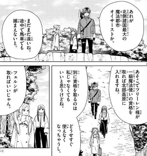 勇者ヒンメルの死から29年後、北側諸国、キュール地方に着いたフリーレン達、魔法都市 オイサーストまであと少しです。オイサーストで一級魔法使いの資格をフリーレンが取れば、北部高原に入ることが出来ます。しかしフリーレンは、私じゃなくてもいいと思うけどね、と言いフェルンが取ればいいと言います。