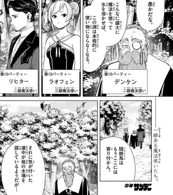 フリーレン達が湖を凍らせた後、他のパーティーは湖の氷を溶かそうとしたり、他の水場を探そうとしています。第13パーティーのデンケン達だけは、第2パーティーのフリーレン達から隕鉄鳥を奪おうと考え、隕鉄鳥を探すのを止めます。