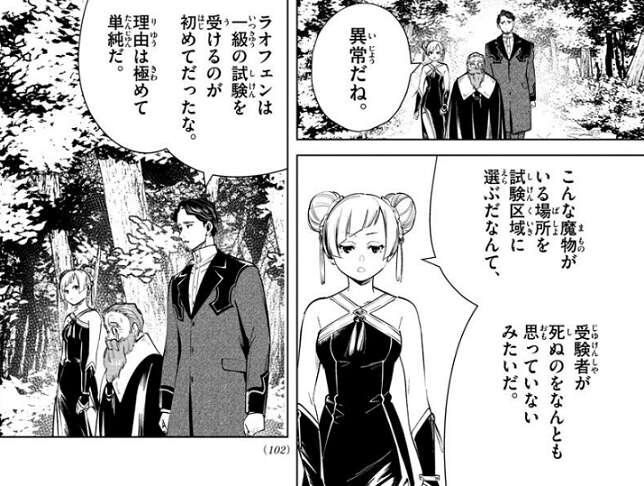 それを聞いたラオフェンは、異常だね、こんな魔物がいる場所を試験区域に選ぶだなんて、と言いますが、この程度で死ぬ奴は一級魔法使いにはいらないという事だ、とリヒターは言います。リヒターは、大陸魔法協会は一級魔法使いの質を気にしているからな、魔王軍と戦っていた時代の、強く誇り高い魔法使いを未だに夢見ている連中がいるのさ、と言います。しかし、時代遅れも甚だしい、とデンケンは吐き捨てます。