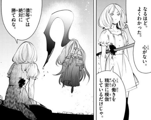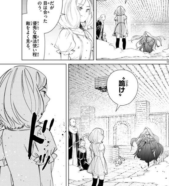 防御魔法は破られましたがエーデルはゼンゼの複製体と目を合わせることに成功し、ゼンゼの複製体に“跪け”と声を掛けて精神操作魔法を使おうとします。しかしエーデルの精神操作魔法は通用せず、ゼンゼの複製体にエーデルは腹を貫かれてしまいます。
