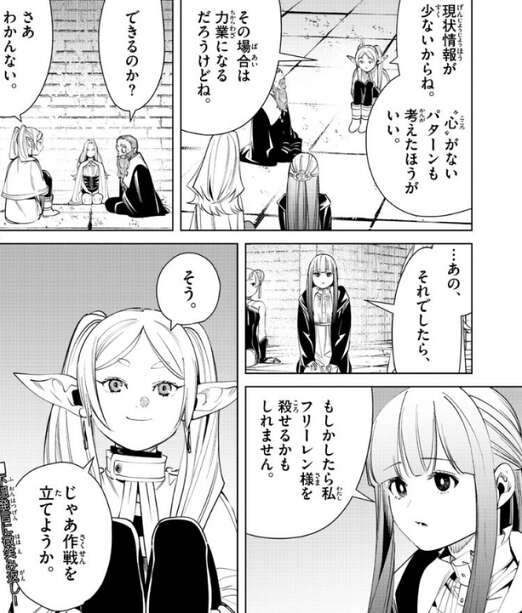 結局、フリーレンの複製体対策は振り出しに戻りますが、フリーレン様なら殺せるかもしれません、とフェルンが過激な発言をします。フリーレンの弱点でも思いついたのか、どんな手段なのか、気になります。