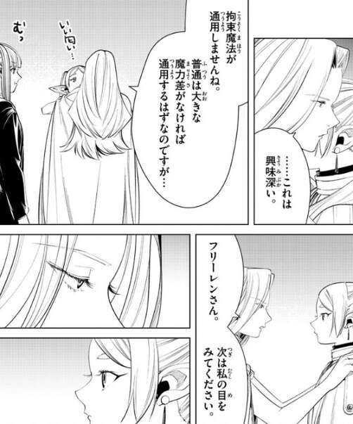 メトーデは拘束魔法が通用するかを調べますが、フリーレンにはやはり通用しません。フリーレンに抱きついたのが面白くないのか、フェルンが隣でむっとしています。さらにメトーデは精神操作魔法も調べますが、フリーレンの精神防御を破ることが出来ません。