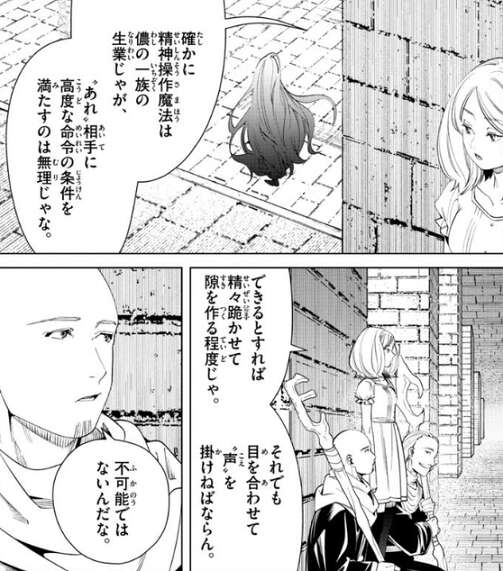 エーデルの一族は精神操作魔法が生業のようですが、それでもゼンゼの複製体相手では高度な命令の条件を満たすのは難しいようです。目を合わせて“声”を掛ければ跪かせて隙を作る程度は出来そうだとエーデルは言いますが、それも複製体に心があれば、の話です。