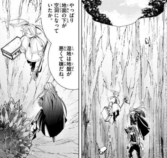 結局、封魔鉱は捨てて先に進んでいますが、捨てた封魔鉱はまだ光っています。目指す北部高原はまだ先のようで、大きな森林と火山地帯を超えた先のようです。現在は数百年、火山帯は噴火もしておらず比較的安全な温泉地帯で、フェルンが温かいお風呂はちょっと魅力的だと言います。そんな話をしていると、地面が急に崩れてフリーレン達は下の空洞に落下してしまいます。地面の下は湿地で地盤が悪かったようで、空洞になっていたようです。