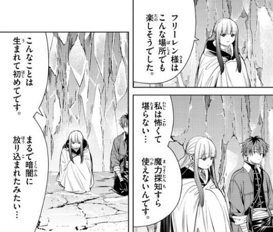 出口を探している途中で野営をすることになり、フリーレンはぐっすりと寝ていますが、フェルンは、怖くて溜まらない…、とシュタルクに感情を打ち明けます。魔力探知が使えず、まるで暗闇に放り込まれたみたい…、と言うと、突然魔物が現れます。
