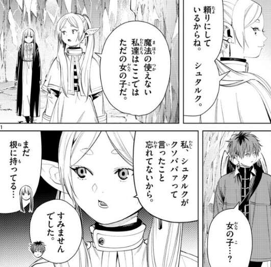 他の出口を探しながらフリーレン達は先を進みますが、フリーレンは、魔法の使えない私達はここではただの女の子だ、と言い、シュタルクに頼りにしていると言います。シュタルクが、女の子…?と、つぶやくと、昔シュタルクがクソババァと言ったことをまだ根に持っているようで、フリーレンはその事を持ち出します。素直にシュタルクは、フリーレンに謝ります。
