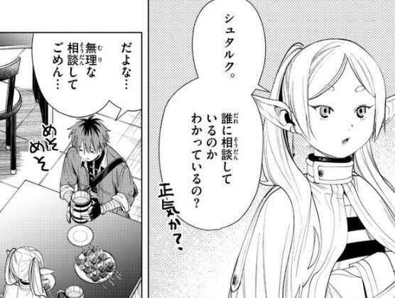相談されたフリーレンは、誰に相談しているのかわかっているの?と、言いますが、シュタルクから、無理な相談してごめん…、と言われると、私はお姉さんだからね、乙女心もばっちりだよ、とフリーレンは急に自信満々な態度を変わります。