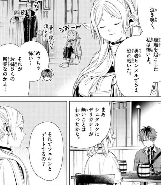 明日は丸一日暇になってしまうとフェルンは言うと、明日は暇だから構ってください、本当に気が利きませんね、シュタルク様は、とシュタルクに当たりのきつい物言いをします。それを聞いたシュタルクはたまには仕返しをしてやるかと思い、明日デートしようぜ、とフェルンをデートに誘います。すると、フェルンは読んでいた本を落として動揺します。