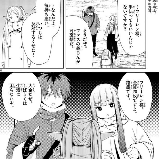 しかし、それを見ていたフェルンとシュタルクはフリーレンに、手伝ってもいいじゃないですか?と、言いファスを手伝いように言います。フリーレンが、…なんだよ、気持ち悪い、いつもは反対するくせに…、と文句を言いますが、金貨20枚あればしばらく生活には困らない、とフェルンとシュタルクはフリーレンを説得します。解除するのに3か月は掛かりそうだけど…、とフリーレンは言いますが、結局結界の解除を手伝うことになります。
