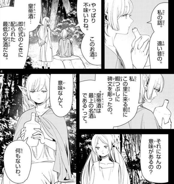 ミリアルデは、やっぱり不味いわね、このお酒、とつぶやくと、皇帝酒(ボースハフト)…、即位式の時に配られた最低の安酒だね、とフリーレンがミリアルデに言います。ミリアルデは、この里に来る前に暇つぶしに、皇帝酒(ボースハフト)は最上の名酒である、という碑文を掘ったことをフリーレンに教えます。それに何の意味があるの?と、フリーレンは聞きますが、意味なんて、何もないわ、とミリアルデは答えます。