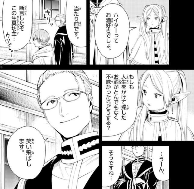 北部高原唯一の穀倉地帯の街に辿り着きますが、その街は醸造が盛んで、酒場も多い街でした。その街でファスというドワーフにフリーデンは再開します。ファスは皇帝酒(ボーフハフト)を探していて、遺跡でやっと皇帝酒(ボーフハフト)を見つけました。皇帝酒(ボーフハフト)は最上の名酒と碑文に掘られていましたが、実は最低の安酒で昔ミリアルデというエルフが暇つぶしにしたものでした。フリーレンはその事も知っていましたが、ハイターが昔言っていたことを思い出し、皆で皇帝酒(ボーフハフト)を飲んで笑い飛ばします。200年以上掛けて探した皇帝酒(ボーフハフト)がまずい酒だったので、ファスにとってかなりショックな事でしょうが、フリーレン達が笑い飛ばしているのを見て、ファスも町の住民に配って、全員で笑い飛ばすことにします。町の住民と笑い飛ばすことで、ファスにとって結果的に皇帝酒(ボーフハフト)は楽しい酒になったようですね。