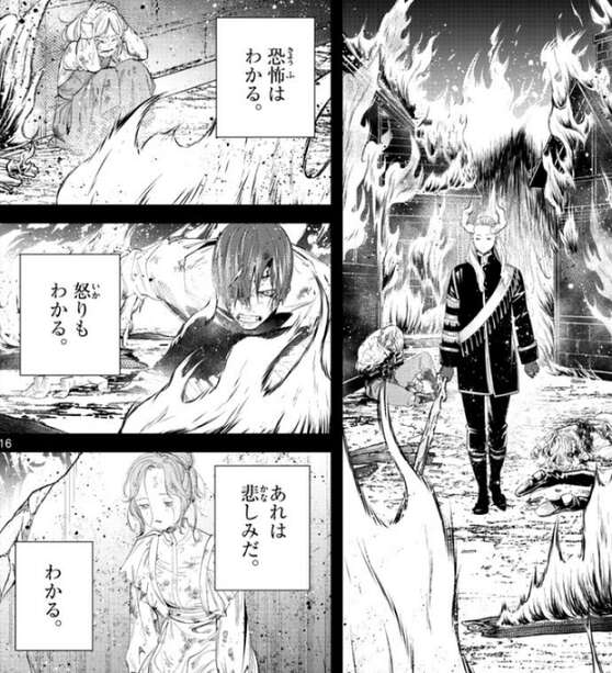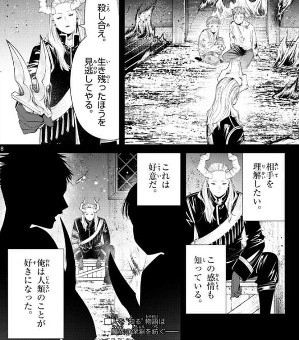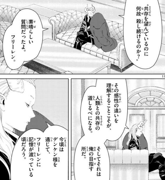 一方、黄金郷にいるマハトはフリーレンとの話し合いを思い出し、フリーレンとした話し合いの事を、実に有意義な話し合いだった、と評価します。そして、“共存を望んでいるのに何故 殺し続けるのか?”というフリーレンの質問を、素晴らしい質問だったよ、とマハトは言った後、その感性の違いを理解することこそが、人類との共存の道しるべになる、そしてそれは俺の目指す所だ、とマハトはつぶやきます。