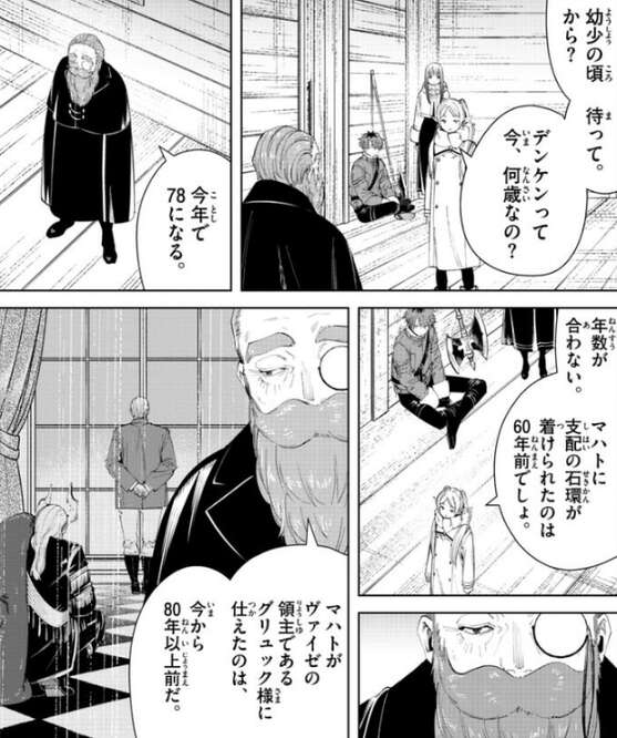 デンケンが幼少の頃からマハトに様々な魔法を教わっていたと知り、フリーレンはデンケンに今、何歳なのか尋ねます。デンケンは今年で78歳になると答えると、マハトに支配の石環が着けられたのが60年前なので、年数が合わないとフリーレンは言います。すると、デンケンはマハトがヴァイゼの領主であるグリュックに仕えたのが、今から80年以上前で、支配の石環が着けられたのが20年前だとフリーレンに答えます。