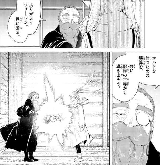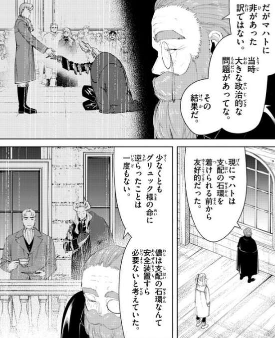 フリーレンはデンケンから、マハトは自分の師だと教えてもらった後、マハトが支配の石環を着けたのはマハトに非があった訳ではなく、当時大きな政治的な問題があったせいだと教えてもらいます。そして、フリーレンはデンケンと百年分のマハトの記憶の解析を始めます。
