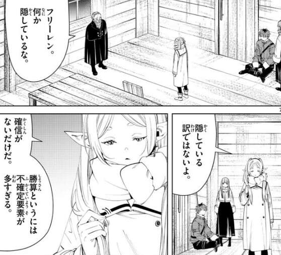 その後、デンケンはフリーレンにマハトとの話し合いで勝算は見つかったか?と、質問しますが、やはり現状ではマハトには勝てない、という結論にフリーレンもなったようです。いつマハトに黄金に変えられてもおかしくなかった、とフリーレンが言うと、なのに盛大に喧嘩を売った、フリーレン、何か隠しているな、とデンケンはフリーレンに問いかけます。しかしフリーレンは、隠している訳でないよ、とデンケンに答え、確信がないだけだ、勝算と言うには不安定要素が多すぎる、とフリーレンは言います。
