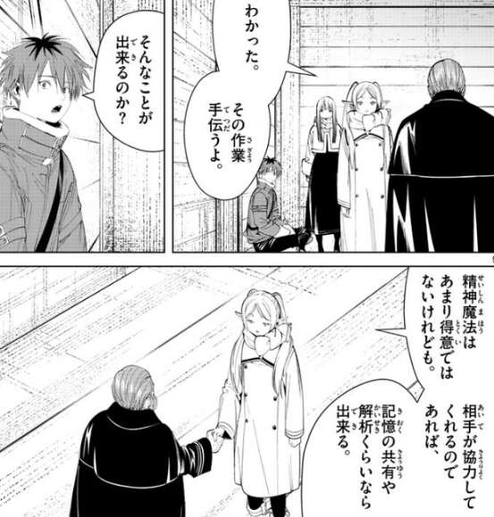デンケンだってその程度の勝算は掴んでいるんでしょ?と、フリーレンは言いますが、デンケンはまだエーデルが読み取ったマハトの記憶を全て解析できていないと言います。エーデルが読み取ったマハトの記憶は100年分あるようで、デンケン一人では詳細を解析するのに時間が掛かるようです。するとフリーレンは、その作業手伝うよ、と言い、デンケンに記憶の共有をしてもらい解析を手伝おうとします。フリーレンは精神魔法はあまり得意ではないようですが相手が協力してくれれば、記憶の共有や解析は出来るようです。