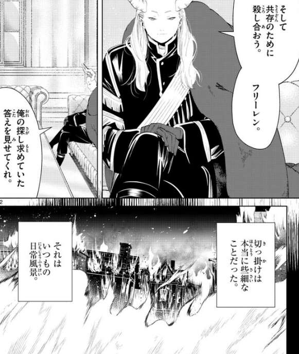 そして、好きなだけ自分の記憶を見るといい、そして共存のために殺し合おう、フリーレン、俺の探し求めていた答えを見せてくれ、とマハトは一人つぶやきます。そしてマハトはその答えを探し求めるようになった、その切っ掛けとなった出来事を回想します。魔王に命じられて人類の村を一つ滅ぼした時の事、マハトはその村の神父と対峙します。