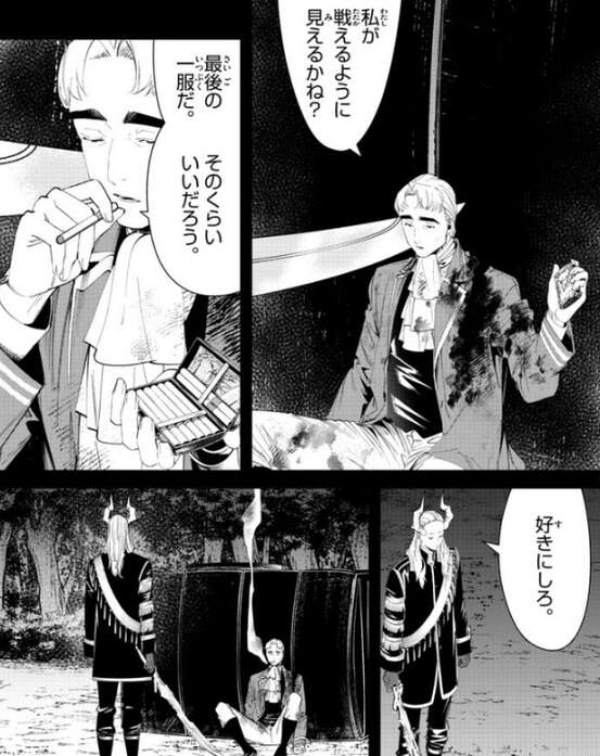 そんな事をつぶやくグリュックにマハトは一つ質問がある、と言うと、グリュックは煙草を吸い終わるまでならな、と答えます。マハトはグリュックに、“悪意”や“罪悪感”に関して質問します。グリュックは魔族には“悪”という概念自体がわからないんだろう、と推測し、その方が幸せと言います。そして魔族には“正義感”もないとグリュックは知ると、自分が城塞都市ヴァイゼの領主で実験などあってないような、お飾りの領主であることをマハトに話します。