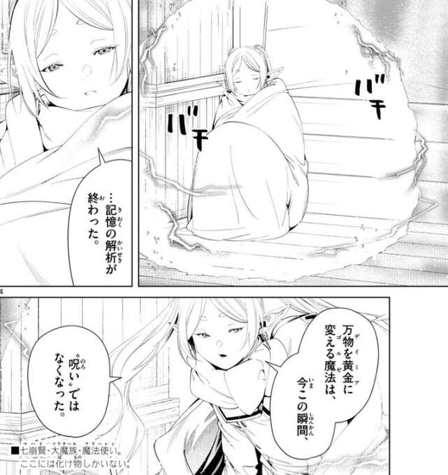 フリーレンの回想が終わり、フリーレンはマハトの記憶と万物を黄金に変える魔法(デイーアゴルゼ)の解析を終えます。解析が終わると同時に、フリーレンの体は黄金から元の状態に戻ります。フリーレンは、万物を黄金に変える魔法(デイーアゴルゼ)は、今この瞬間、“呪い”ではなくなった、と言うと動き出そうとします。