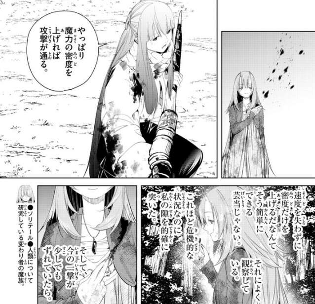 それでもフェルンとシュタルクは諦めず、フェルンは速度を失わず魔力の密度だけを上げた魔法でソリテールを攻撃し、ソリテールにダメージを与えます。