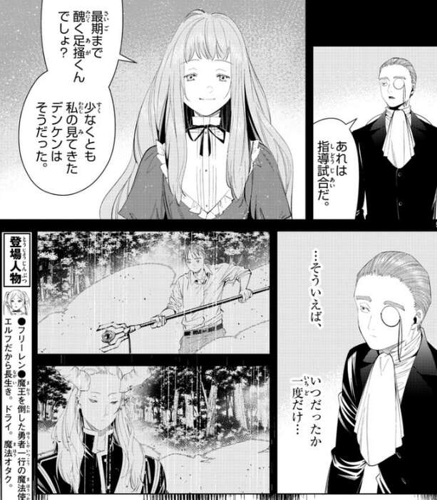 ソリテールは、マハトは人類との共存を心から望んでいる、と指摘するとデンケンの魔法攻撃をかわし、デンケンを剣で攻撃します。デンケンはソリテールの攻撃を防御魔法で防ぎますが、その間にマハトはフリーレンを剣で直接攻撃します。マハトの攻撃もフリーレンは防ぎ、一進一退の攻防が続きます。フリーレンはマハトが人類との共存を望んでいる時点で、他の魔族とは違うことを認め、その1点においては敬意を表すと言います。そして、フリーレンの知る限りでは、人類にこれほど歩み寄った魔族はマハトで二人目だと言います。
