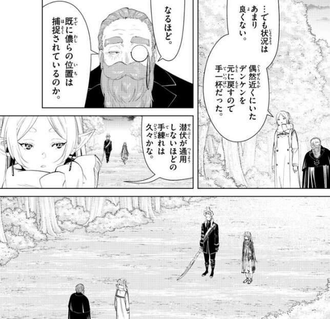 夢から覚めると、デンケンはフリーレンに防護魔法をかけてもらい、デンケンの体は元に戻っていました。デンケンが倒れて一時間ほど経っていたようですが、あまり状況は良くなく、フリーレンは偶然近くに倒れていたデンケンを元に戻すだけで手一杯だったようです。フリーレンは一応、潜伏してデンケンにかかっていた万物を黄金に変える魔法(デイーアゴルゼ)を解除したようですが、フリーレンはすぐにマハトとソリテールに見つかってしまいます。