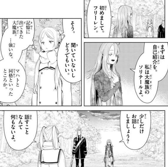 マハトは万物を黄金に変える魔法(デイーアゴルゼ)の解除に成功したフリーレンを生かして帰すわけにはいかないと言いますが、フリーレンはマハトが最初から生かして帰すつもりなんてなかったでしょ、と指摘します。ソリテールは相変わらずマイペースで自己紹介をすると、少しだけ話をしましょう?と、フリーレンに言います。