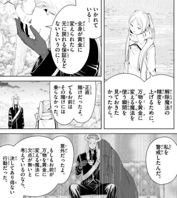 さらにフリーレンは解除魔法の精度を上げるために、話し合いの場でマハトに喧嘩を売って万物を黄金に変える魔法(デイーアゴルゼ)を使う瞬間をもう一度見ようとしました。しかし、マハトはフリーレンを警戒して万物を黄金に変える魔法(デイーアゴルゼ)を使いませんでした。今考えれば、マハトはゼーリエの使った呪い返しの魔法(ミステイルジーラ)のような切り札を警戒したようですが、フリーレンにとってはこの情報だけで十分でした。