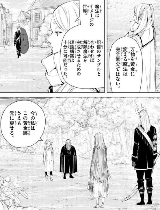 万物を黄金に変える魔法(デイーアゴルゼ)は完全無欠ではないという情報と、記憶のサンプルを合わせればフリーレンにとって解除魔法を完成させるための理論構築は十分でした。フリーレンはマハトとソリテールに、今の私はこの黄金郷さえも元に戻せる、と断言します。