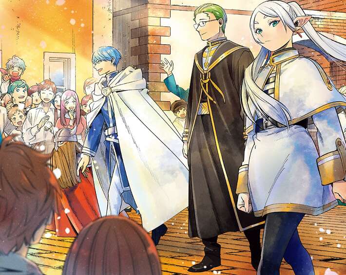 勇者ヒンメル、戦士アイゼン、僧侶ハイター、魔法使いフリーレンの勇者一行は魔王を倒し王様に報告しています。王様が広場に勇者一行の彫像を作ってくれるそうで、広場で酒や食べ物を楽しみながらこれまでの10年の冒険を振り返っています。