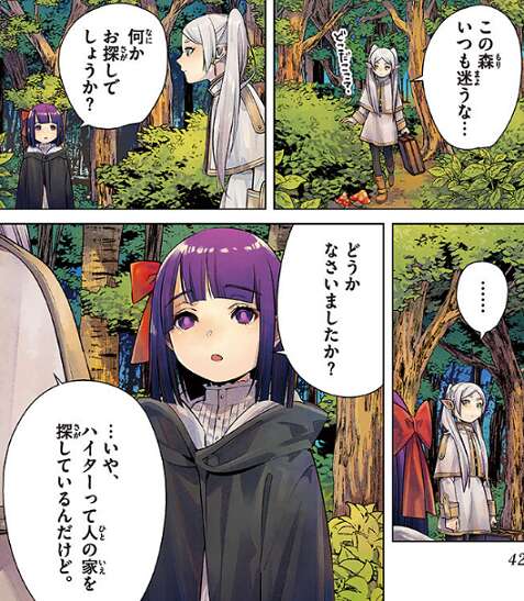 勇者ヒンメルが亡くなり、フリーレンはもっと人間を知ろうとするたびに出ます。そして勇者ヒンメルの死から20年後、中央諸国、聖都シュトラール郊外の森をフリーレンは歩いています。この森いつも迷うな…、とフリーレンが呟いていると、一人の少女が声をかけてきます。ハイターって人の家を探しているんだけど、とフリーレンが言うと、少女はフリーレンの家に案内してくれます。