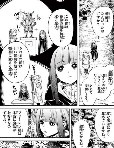 勇者ヒンメルの死から26年後、中央諸国、ターク地方でフリーレンとフェルンは人々の頼み事を聞いてあげる報酬として、色々な魔法を収集していました。それは温かいお茶が出てくる魔法だったり、銅像の錆を綺麗に取る魔法だったり、甘い葡萄を酸っぱい葡萄に帰る魔法だったりと、変な魔法ばかりです。フェルンからは、変な魔法ばかり集めていますね、と呆れます。そして、次の依頼は薬草家のおばあちゃんからの依頼で、放置されている勇者ヒンメルの銅像を綺麗にするというものです。