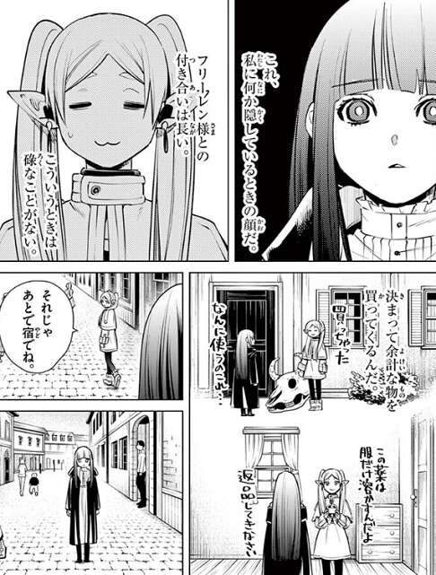 勇者ヒンメルの死から27年後、交易都市、ヴァルムでフリーレンは、手分けをして旅の物資を補給しようか、とフェルンに話しかけています。しかし、フリーレンから貰ったメモを見ると、必需品はほとんどフェルンが買うことになっており、フリーレンは何を買うのか、フェルンは聞きます。すると、…薬草とかだよ、とフリーレンは答えますが、その表情は何か隠しているときの顔で、こういうときはフェルンにとって碌なことがありません。
