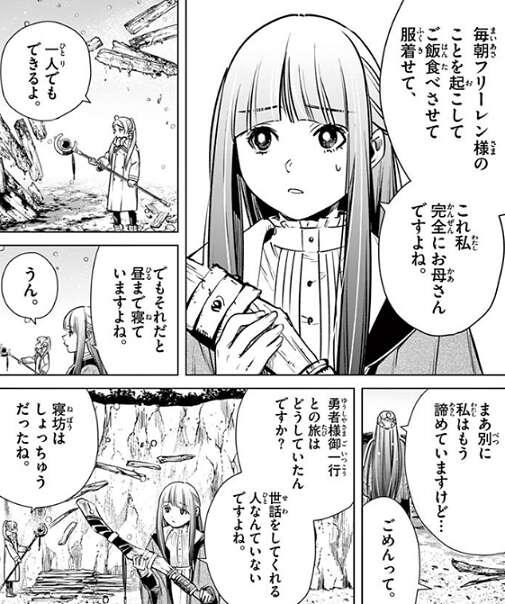 勇者ヒンメルの死から28年後、中央諸国、グランツ海峡は古くからの航行の難所で色々な物が流れ着きますが、今は人手が足りず放置されてします。フリーレン達はこの海岸の清掃の依頼を引き受けることにします。報酬は大魔法使いフランメの著書ですがフェルンは魔導書が偽物だと見抜きます。そして、フリーレン達が海岸の清掃を引き受けて三カ月が過ぎ季節は冬になっています。フリーレンは毎朝、フェルンに起こしてもらいご飯を食べさせてもらい、服を着せてもらっていてフェルンから、これ私完全にお母さんですよね、と呆れられてしまいます。勇者一行と旅していた時、寝坊はしょっちゅうでしたが、怒られたのは一度だけだとフリーレンは言います。