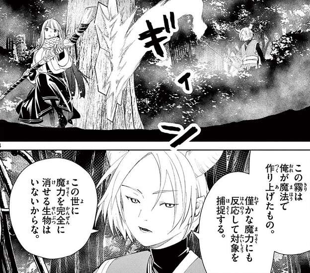 フリーレンから戦闘を一人で行うように言われ、フェルンは魔族と一人で対峙しますが霧を晴らす魔法(エリルフラーテ)を操る魔族に苦戦します。一方、メトーデはもう一人の魔族と戦闘中ですが、堅実な戦い方をする魔族で隙を見せず、フェルンと協力したいとメトーデは考えますが、魔法の霧が邪魔をして協力も難しそうです。