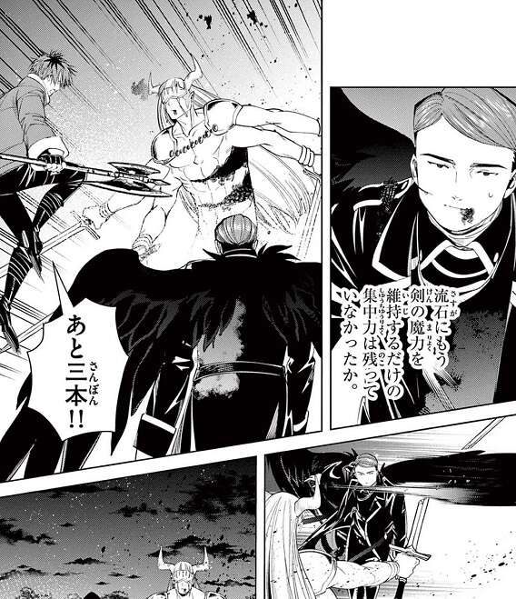 レヴォルテ、シュタルク、ゲナウはお互い致命傷を負った状態ですが、シュタルクとゲナウは協力して、レヴォルテを追い詰め、四本の剣も全て破壊することに成功します。全ての剣を破壊したシュタルクとゲナウは、レヴォルテに止めを刺そうとしますが、レヴォルテは素手でシュタルクとゲナウの攻撃し、腹を貫きます。