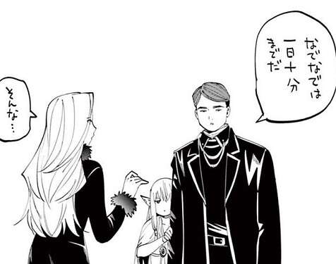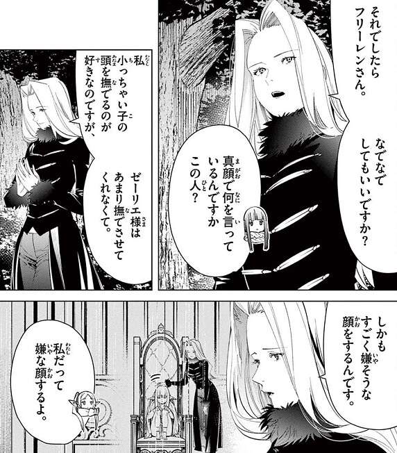 第73話で、メトーデがゼーリエはあまりなでなでさせてくれないし、すごく嫌な顔をすると言っていましたが、なでなでは一日十分までだ、とゲナウに注意されています。ゼーリエはゲナウの背中に隠れてメトーデの様子を窺っていますし、ゼーリエはメトーデになでなでされるのが、本当に嫌なようですね。