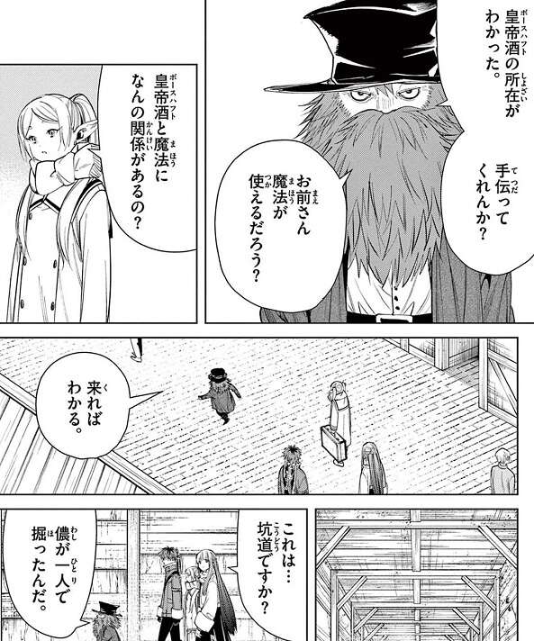 北側諸国、ビーア地方に到着したフリーレン達は、皇帝酒(ボースハフト)の噂を聞きます。皇帝酒(ボースハフト)とは、大昔に大陸の大半を統治していた大帝国があって、その皇帝に献上された最上の名酒の事だそうです。そんな噂の話をしていると、フリーレンにファストというドワーフが話しかけてきて、一緒に皇帝酒(ボースハフト)がある坑道に来て欲しいとフリーレンに頼みます。