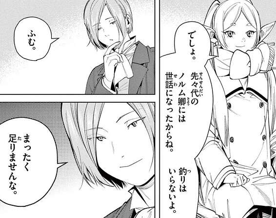北側諸国、ノルム商会領の城塞都市に到着したフリーレン達ですが、都市に入る手続きをしていると、フリーレンは商会長のノルムに呼び出されてしまいます。フリーレンは80年前に先々代のノルム商会長に莫大な借金をしていて、その借金を返すように突然、迫られます。結局、フリーレンは借金を全て返すことが出来ず、借金の形に鉱山で300年働かされることになってしまいます。